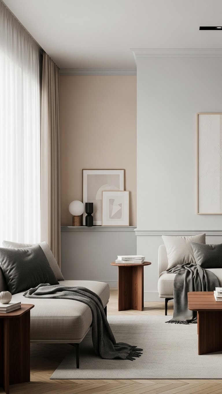When you start decorating, pick a light, neutral wall palette to instantly brighten the room and create a calm backdrop for furniture and textiles. Choose soft gray or warm beige tones to open sightlines and let your pieces breathe. Use matte finishes, minimal trim, and contrast with darker accents sparingly. This gives you freedom to swap textiles and art without repainting.
