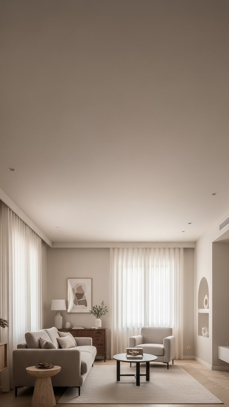 After painting ceiling and walls the same soft neutral, carry that calm into your furniture by choosing pieces within a single color family. You’ll create cohesion with textured neutrals—linen, boucle, warm wood—so each item breathes without competing.