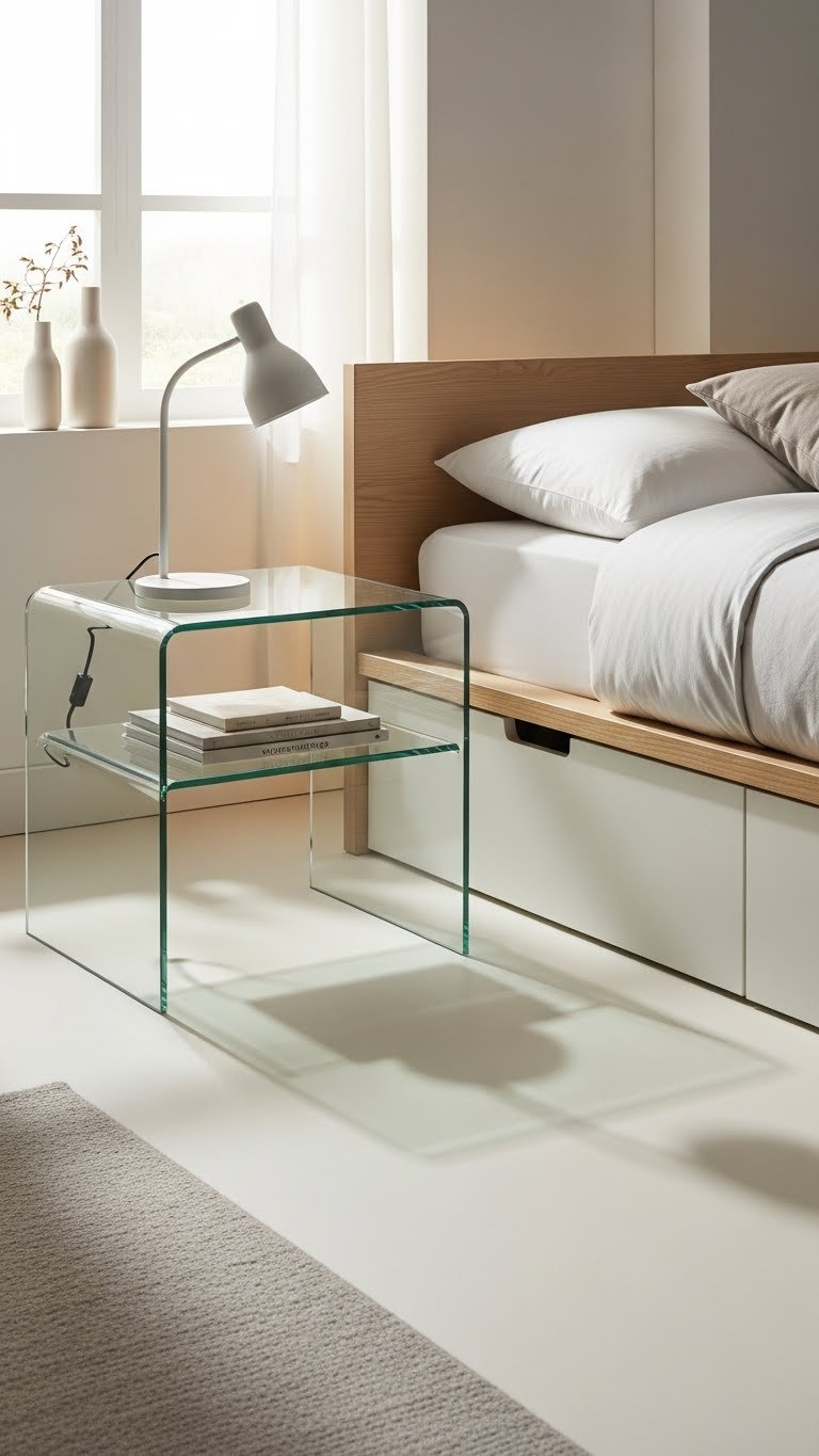 Having hidden storage under the bed keeps surfaces clean, so glass or acrylic nightstands are the next smart move to preserve that airy feel while adding function.