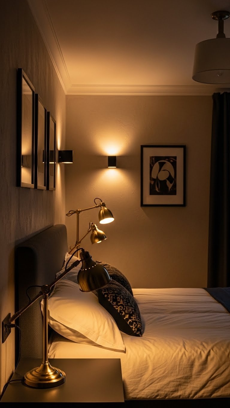 You’ll mix layered lamps with wall sconces and bedside fixtures, create dimmer zones for mood control, and arrange light to expand sightlines, maintain calm, and let you choose atmosphere on demand.