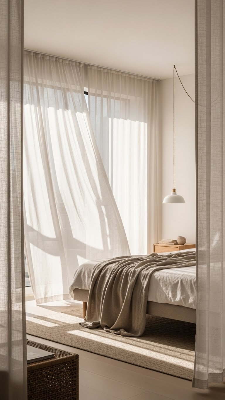 Suspending pendant lights clears the floor and sharpens your bedroom’s silhouette; now let natural light do the same work. Choose airy linen panels or delicate filter curtains to brighten, soften edges, and preserve privacy without weighing the room.