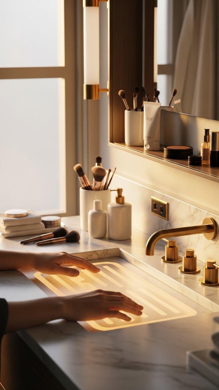 Treat your vanity like a spa station by adding heated countertops that keep toiletries, makeup tools, and wrists warm while you get ready. Choose heated marble for sleek, cool-to-the-eye luxury that radiates gentle vanity warmth, pairing minimalist brass fixtures and hidden controls. You’ll enjoy crisp mornings, effortless glam, and a liberated routine — practical warmth that feels indulgent and utterly modern.
