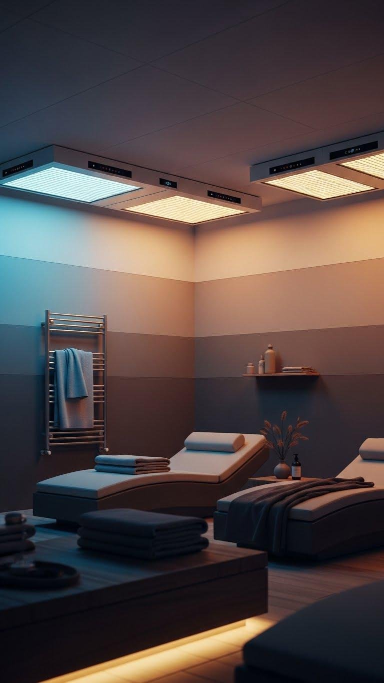 After layering chromotherapy for mood and circadian support, add infrared radiant panels to introduce gentle, health-forward warmth that feels like a spa wrap.