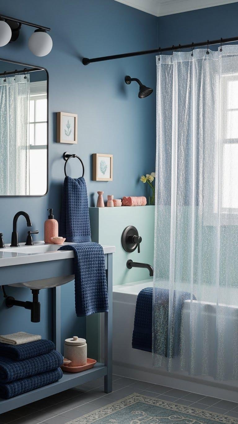 Layer marine textiles, like textured towels and a shimmery shower curtain, to evoke waves. Add subtle coral accents in ceramics or art for contrast.
