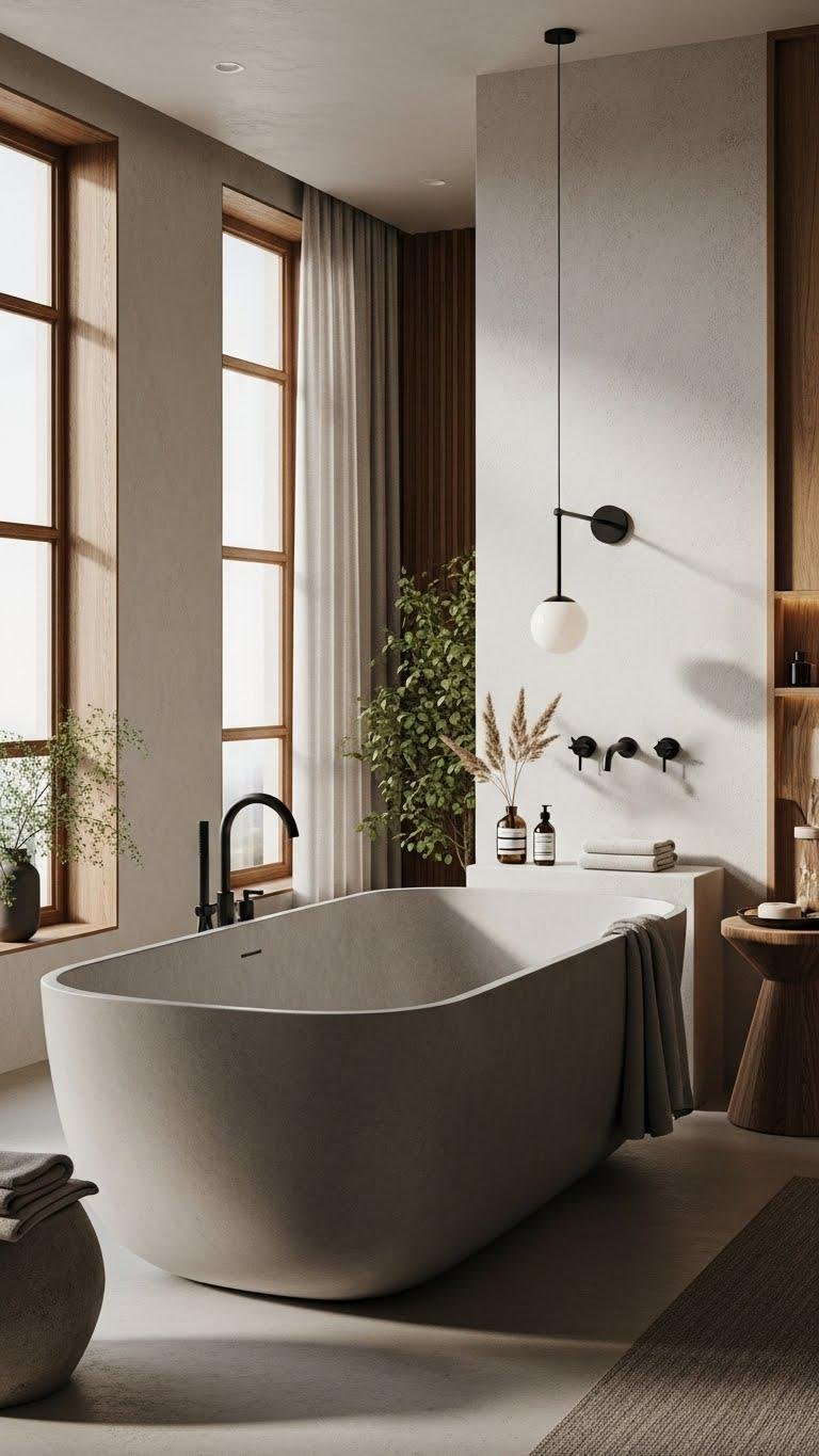 Anchor your bathroom with a deep soaking tub that reads like a sculptural statement — generous depth, clean silhouettes, and tactile finishes invite you to linger. Position it for views, light, and privacy; tub placement transforms the room into a ritual zone.