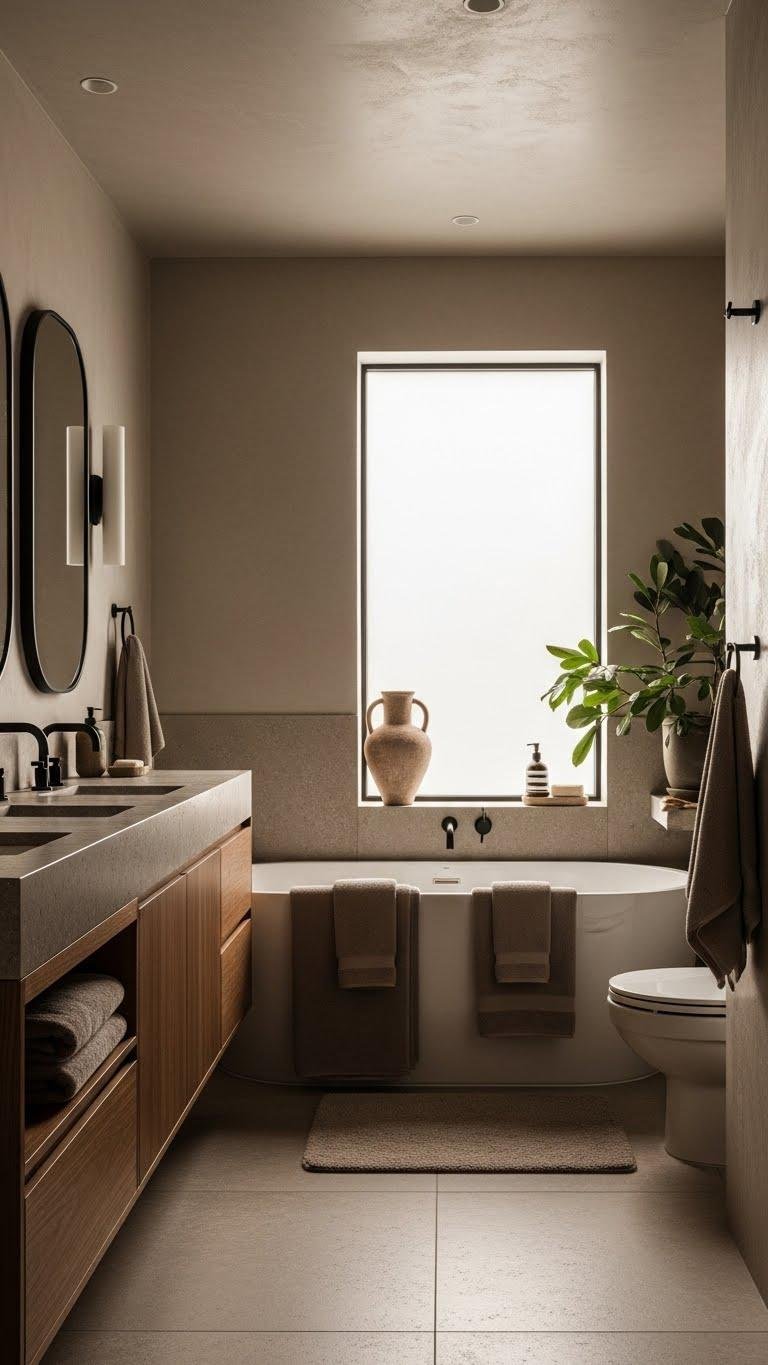 Although subtle, taupe and warm browns instantly ground a bathroom and make it feel lived-in and luxe. You’ll layer taupe textiles for soft warmth, pair with warm brown cabinetry to anchor the space, and add matte stone finishes for depth.