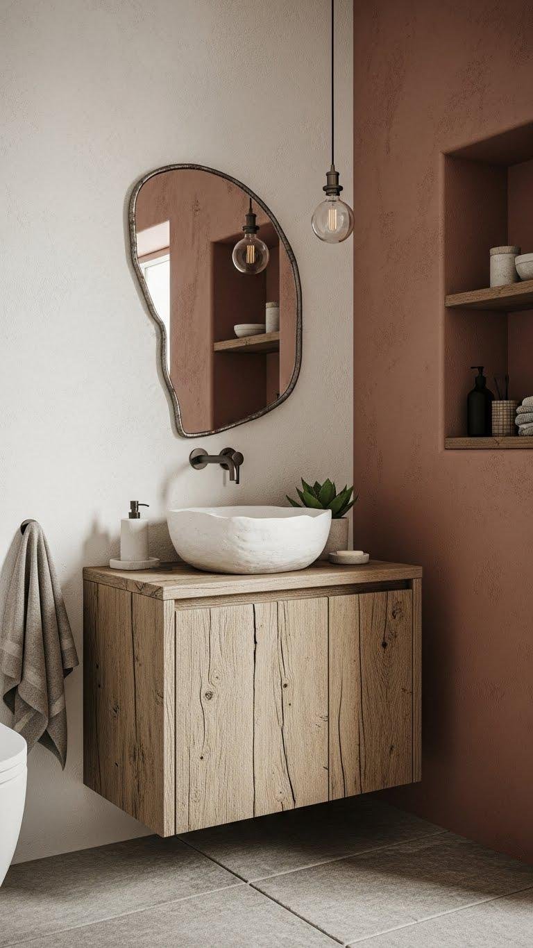 You’ll choose weathered textures, natural wood, and hand-formed sinks that celebrate time. Embrace asymmetrical shapes in mirrors and shelving, limit decor to essentials, and create a calm, unconfined space that feels liberated, quiet, and deliberately unfinished.