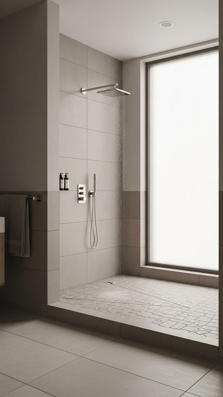 After choosing soft matte tiles to ground the room, you can open the space further by removing the shower door and embracing an open-concept layout. Opt for a curbless entry and gently sloped floor so water retreats unseen. Choose textured flooring for grip and visual warmth, add a minimalist rainhead, and keep sightlines clean to foster a free, spa-like atmosphere.