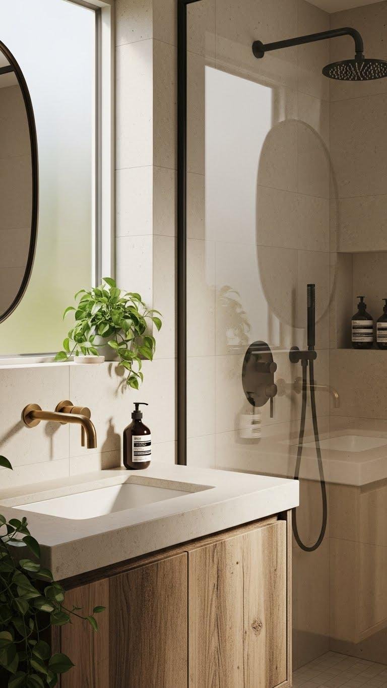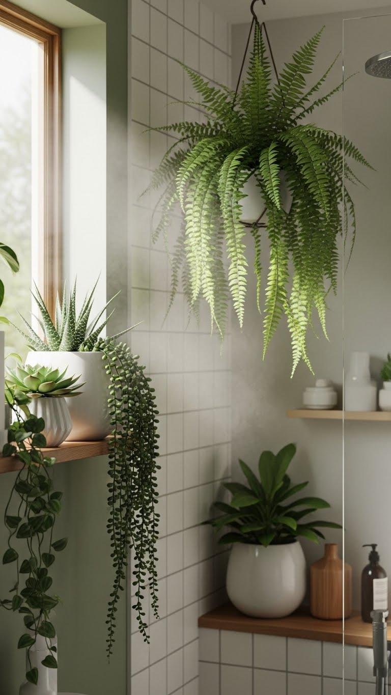Place low maintenance succulents on a sunny shelf and hang air purifying ferns near the shower to combat humidity. Mix sculptural pots and trailing greens for a spa-like, free-feeling vibe that’s effortless to maintain and instantly restorative.
