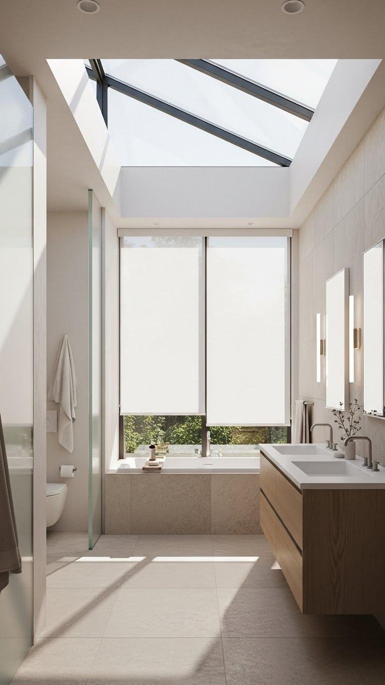 Bring in more daylight with large windows or a skylight to instantly lift the room’s mood and reveal textures and finishes. You’ll choose skylight placement to flood soaking and vanity zones, balancing privacy with views. Opt for minimal window treatments—sheer panels or motorized shades—so light stays flexible. Embrace openness, glare control, and airy lines to make the bathroom feel liberated and spa-like.