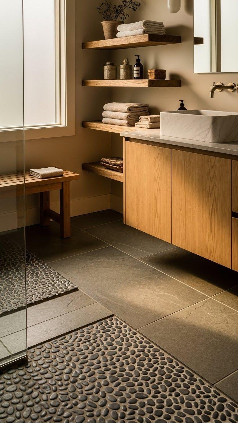 Tactile elements like a pale oak vanity or honed slate floor ground a bathroom and add instant warmth, so use wood and stone where you touch and see them most. Choose reclaimed teak shelving, a floating bench, or a marble sink to keep things honest. Scatter river pebble mats or a pebble-bordered shower floor for texture that feels wild, simple, and freeing.