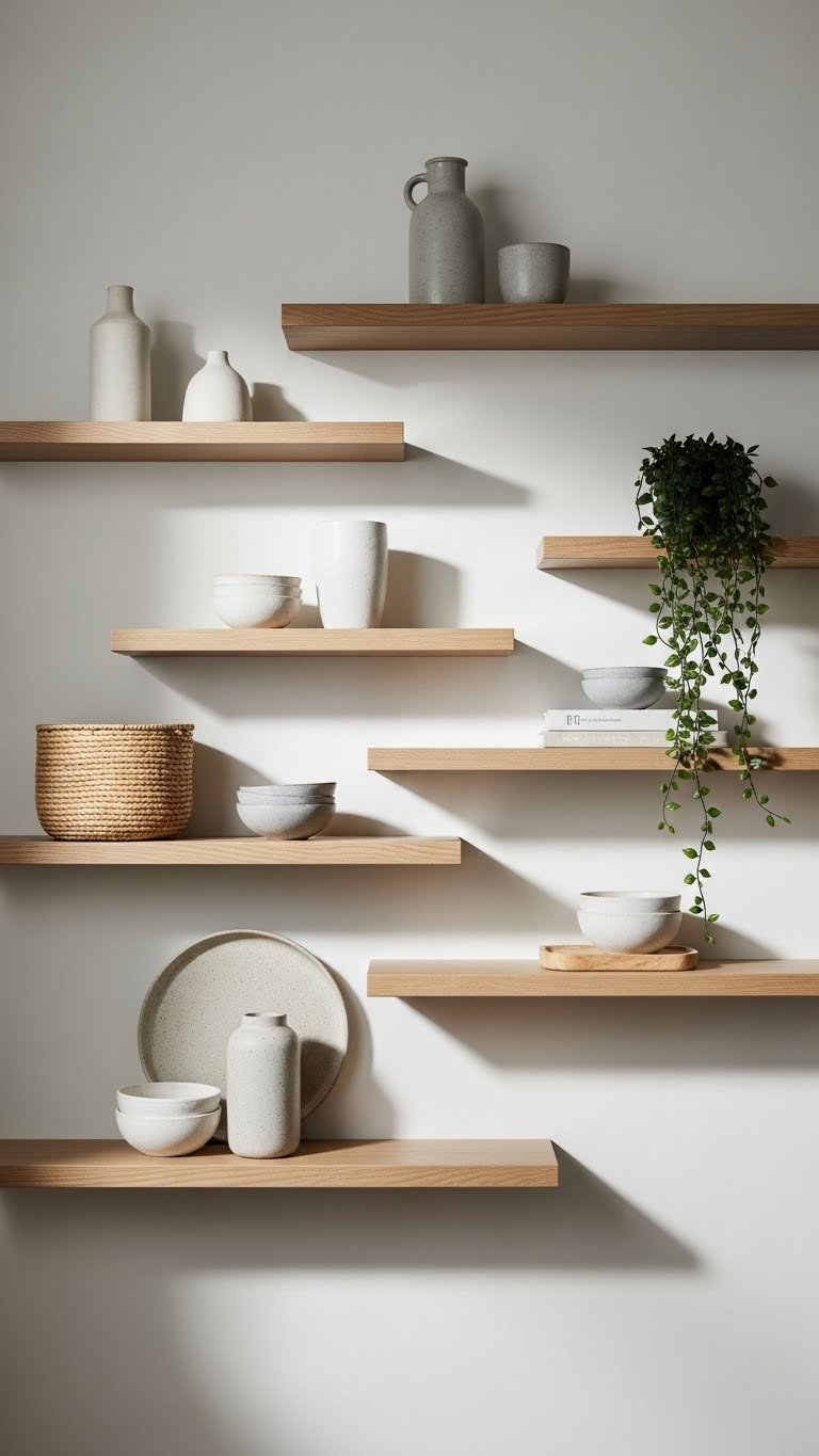 You’ll favor asymmetrical spacing to keep the look free and unforced. Mix textures, minimal ceramics, and a trailing plant. Arrange with intention so each shelf feels like a curated pause.
