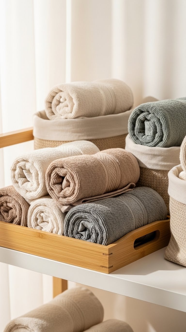 A few brightly hued towels can instantly lift a neutral shelf, giving your bathroom a curated, gallery-like touch that catches the eye without cluttering the space.