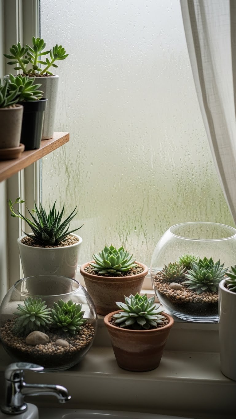 When you pair potted succulents with a humid bathroom, choose varieties that tolerate moisture and low light so they stay crisp rather than mushy; haworthias, some echeverias, and sempervivums can handle occasional humidity if they get good airflow and fast-draining soil. Place small pots or open terrariums where air moves, follow terrarium care basics, and enjoy humidity tolerant succulents that feel effortless.