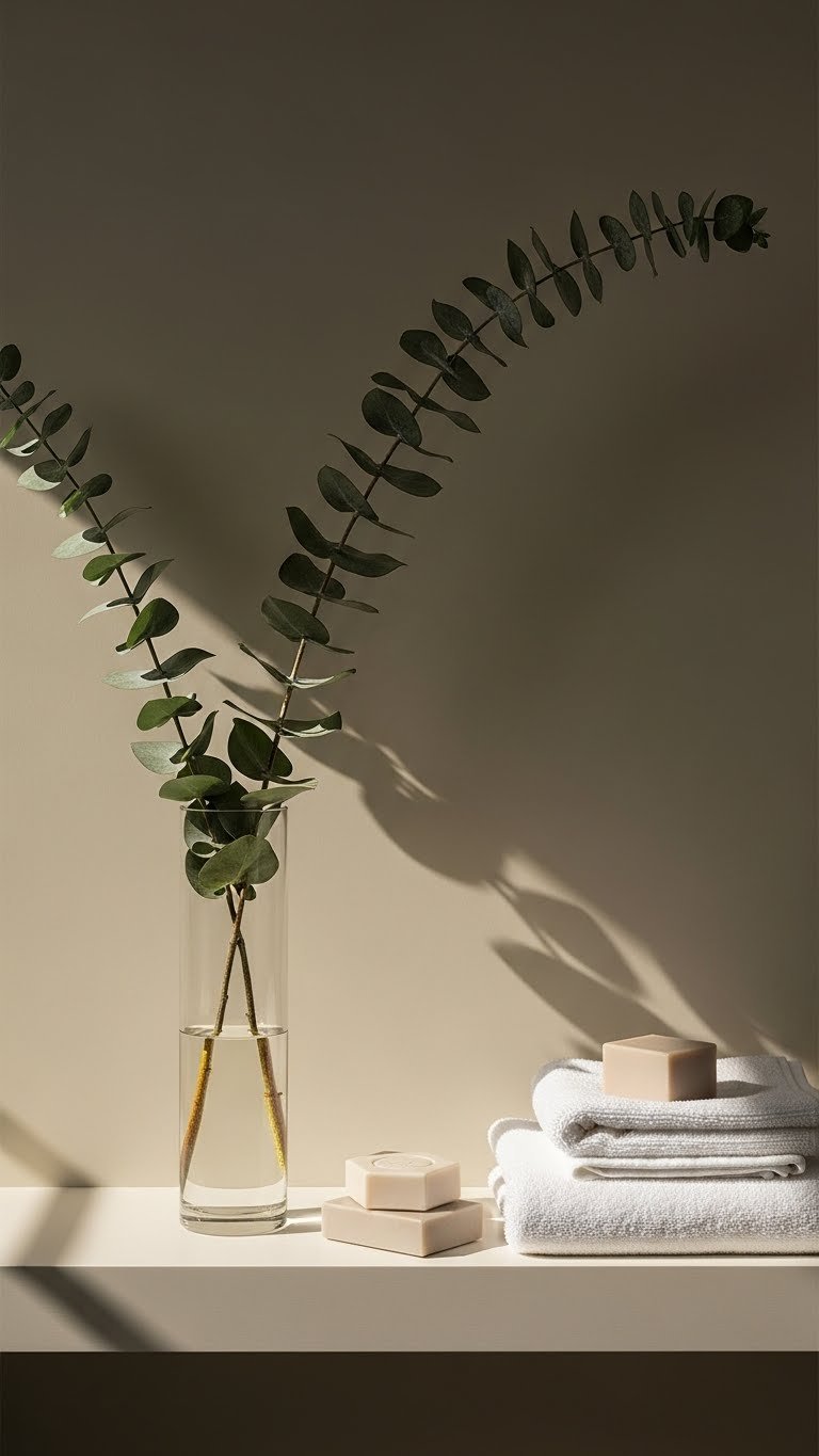 Pair eucalyptus bundles with stacked towels and minimalist soaps; you’ll enjoy aromatherapy diffusion from steam or a nearby diffuser.
