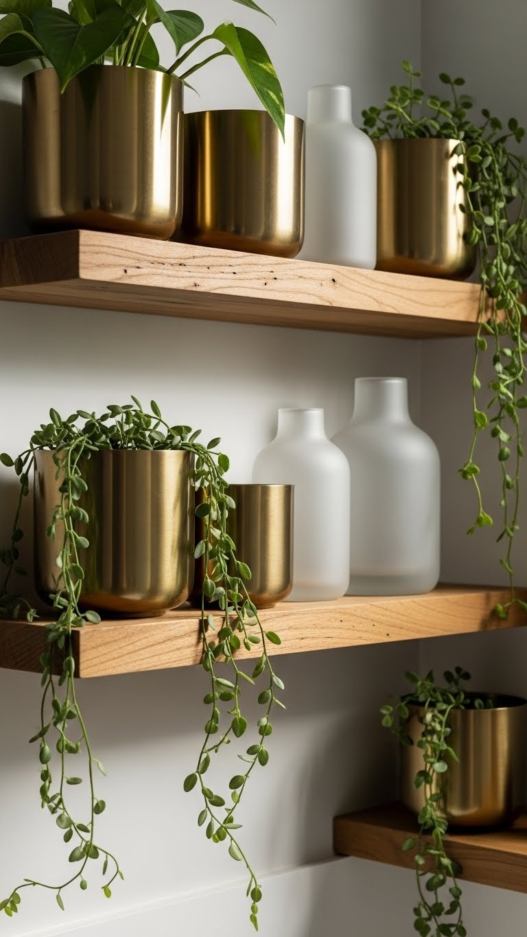 You’ll pair reclaimed teak shelves with brass planters and frosted glass vases, then tuck trailing pothos into corners for motion.