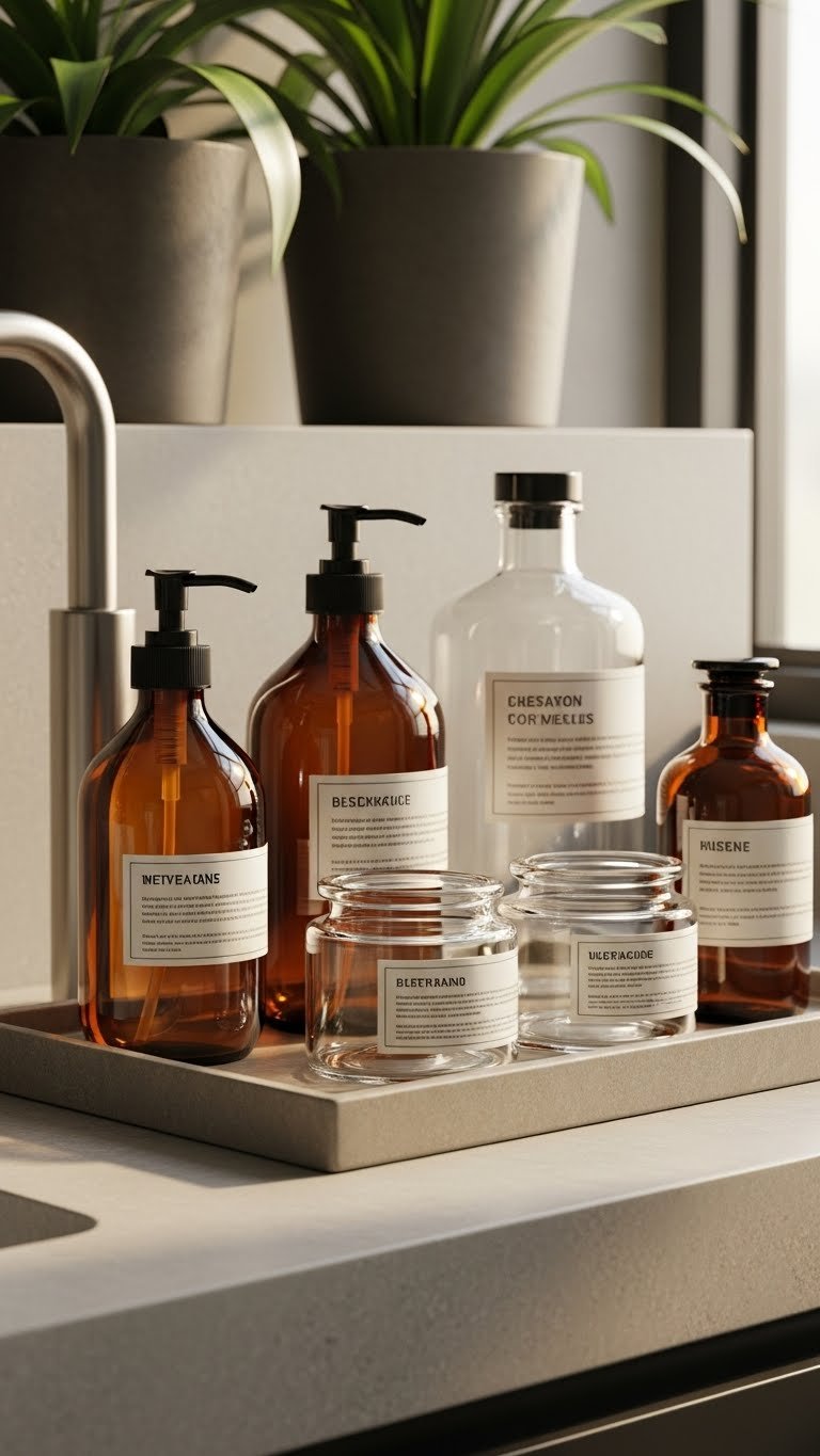 You’ll swap mismatched plastic for amber dispensers, clear jars, and minimal apothecary labels. Arrange by height, keep a neutral palette, and refill with your favorite blends—simple, freeing, intentional.
