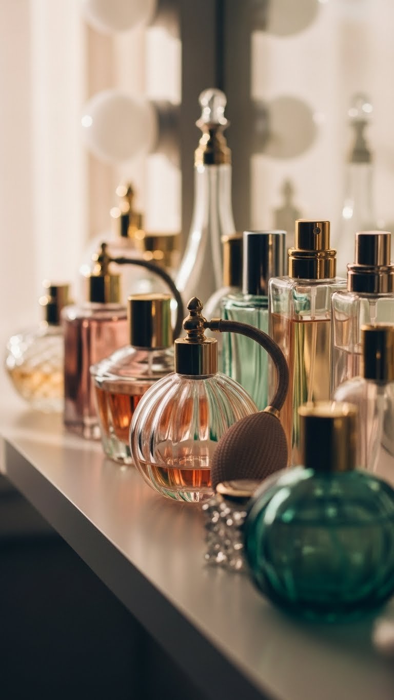 Once your refillable stations feel calm and ordered, let decorative perfume bottles add personality and poetry to the shelf. You’ll arrange vintage atomizers with modern sprays to create contrast, choose colored glassware for subtle color and translucence, and keep spacing intentional.