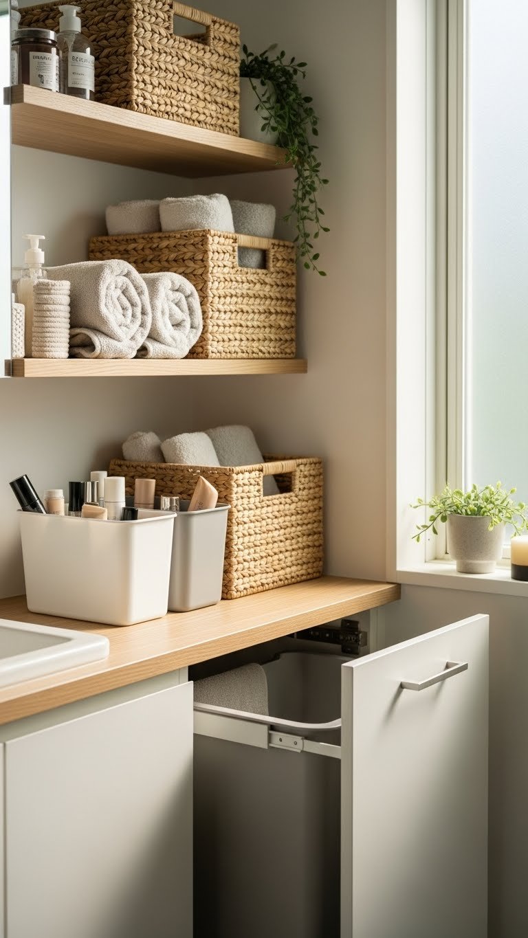Tuck clutter out of sight with baskets, bins, and hidden pull-outs that keep your bathroom looking calm and curated.