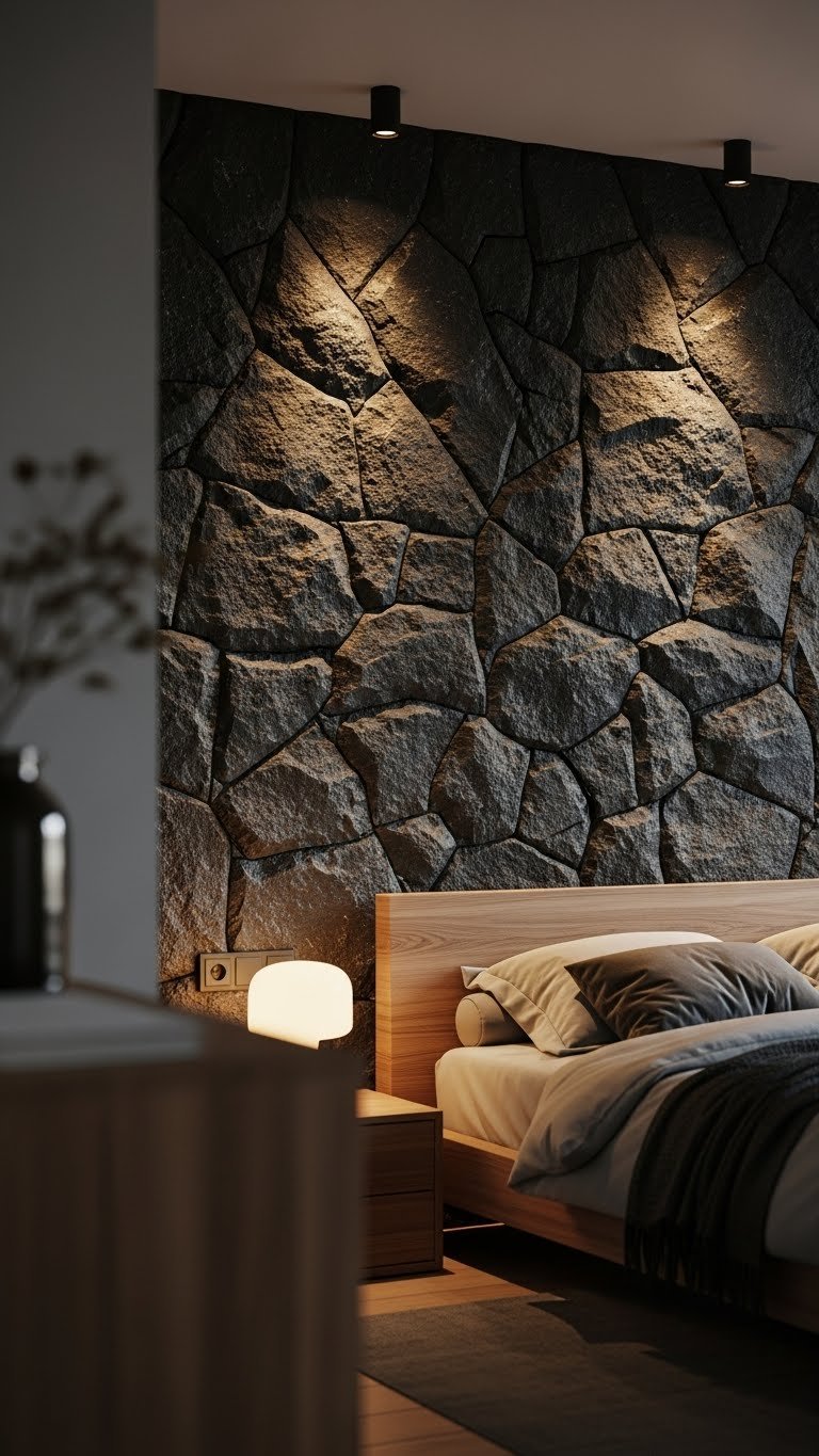 Evoking the raw drama of volcanic rock, a faux basalt stone wall gives your bedroom a bold, textural anchor without the weight or cost of real stone.