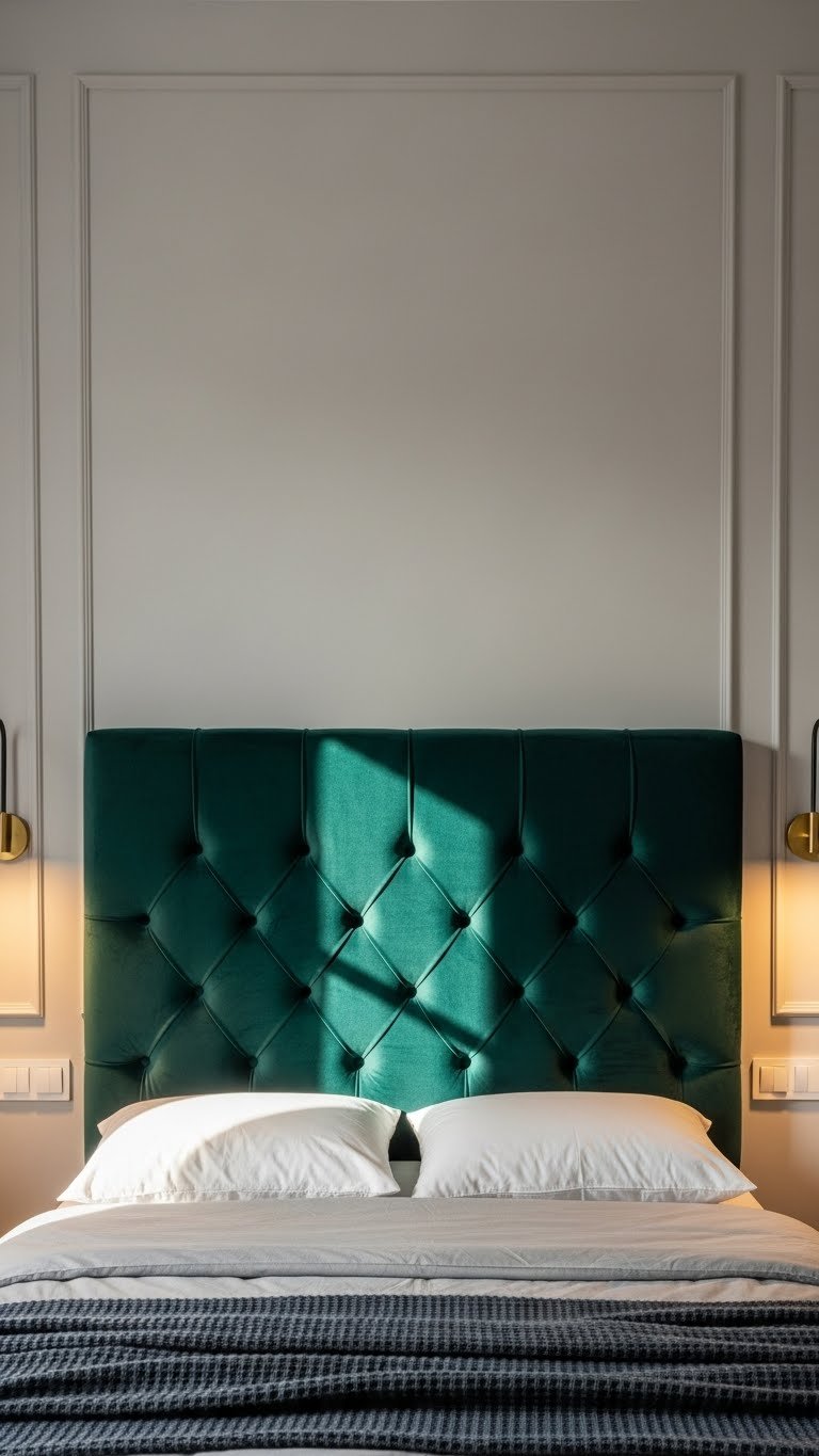 Choose a tufted velvet panel in jewel tones to make a bold, freeing statement. Mount it tall for visual height, add slim sconces for reading, and keep surrounding walls minimal so the rich fabric becomes your calm focal point without clutter.