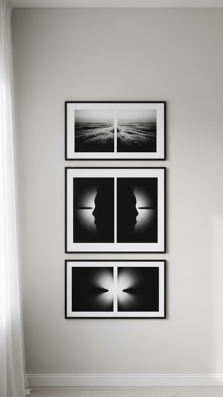 If the diptych reads as a horizontal anchor, stacking black-and-white pieces vertically will lift the eye and add height to the room.