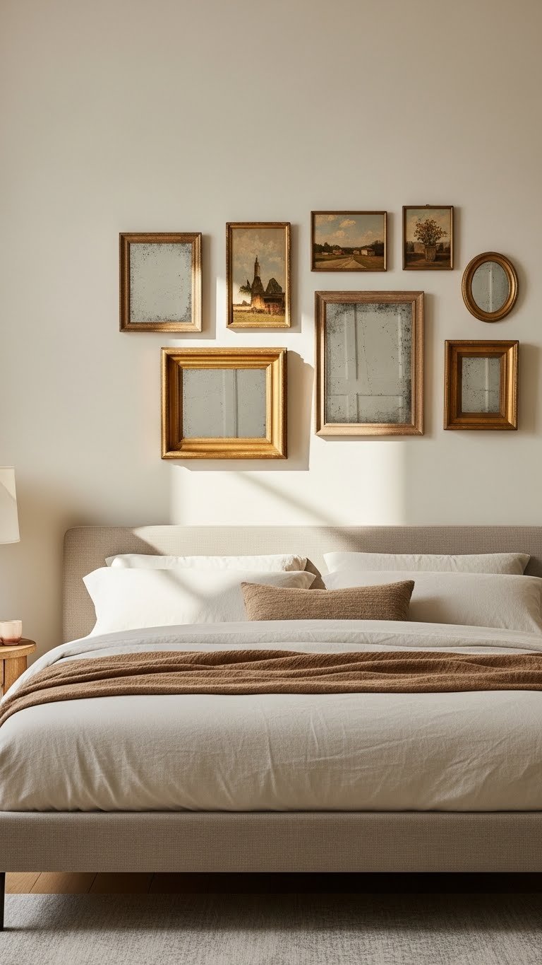You’ll pick a loose, airy layout centered over the headboard, mixing antique frames with small paintings and distressed mirrors to catch light. Keep scale balanced, limit palette, and hang pieces at eye-friendly heights so the display feels free, intentional, and restful.