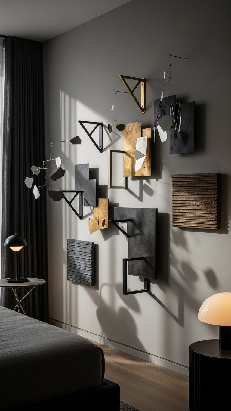Anchoring your bedroom with a wall-mounted sculptural statement turns flat surfaces into focal points that read like modern art and functional design at once. Choose pieces—metallic mobiles, geometric brackets, layered reliefs—that cast shifting shadow play as daylight and lamps move.