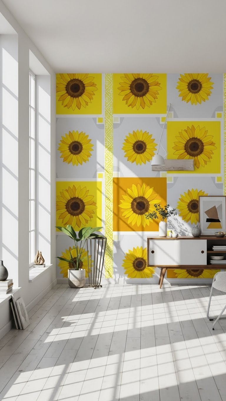 Move from layered stripes to a bolder focal wall by choosing a graphic-print wallpaper that uses yellow accents to energize the space. You’ll pick patterns with sunflower motifs or crisp geometric accents to create movement and optimism. Pair the paper with simple furniture, let light play off the prints, and keep accessories minimal so the wall feels free, lively, and unconfined.