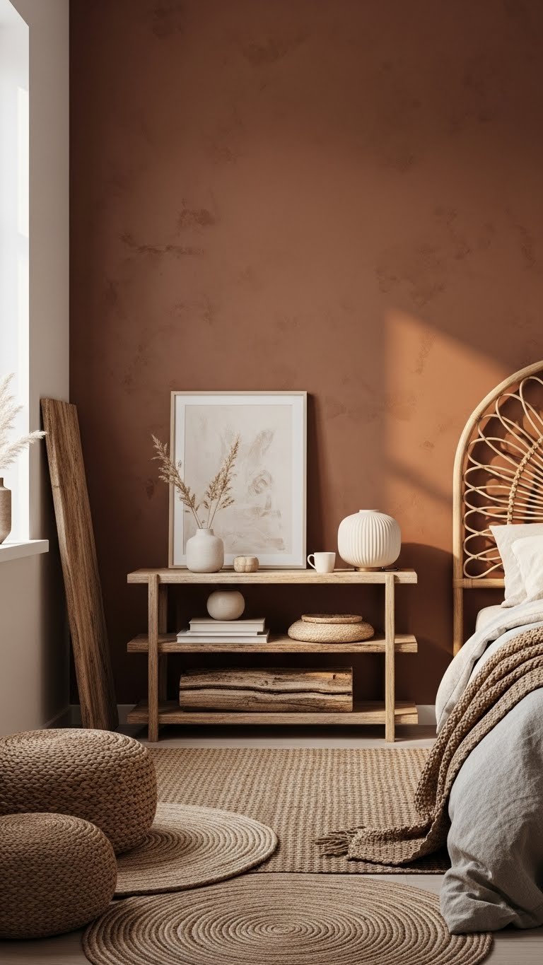 When you paint a wall in rich mocha brown and layer in natural textures—think woven jute, raw wood, and soft linen—it instantly grounds the room and invites a warm, tactile calm. You’ll pair mocha textures with natural textiles, add open shelving and a rattan headboard, and choose minimal artwork. The result feels free, cozy, and effortlessly refined.