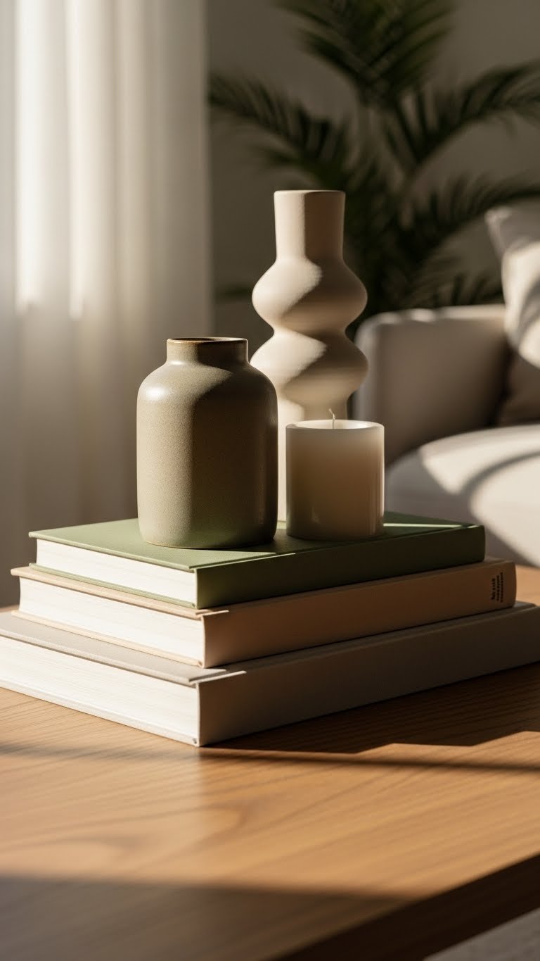 When you arrange items on a coffee table, vary heights to create depth and a curated look: stack two or three books as a low base, add a medium-height vase or candle, and finish with a taller sculptural object or plant.