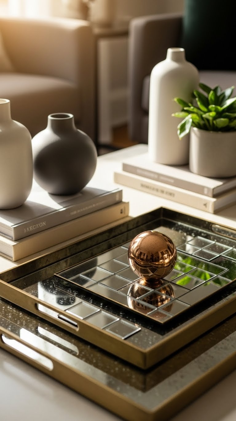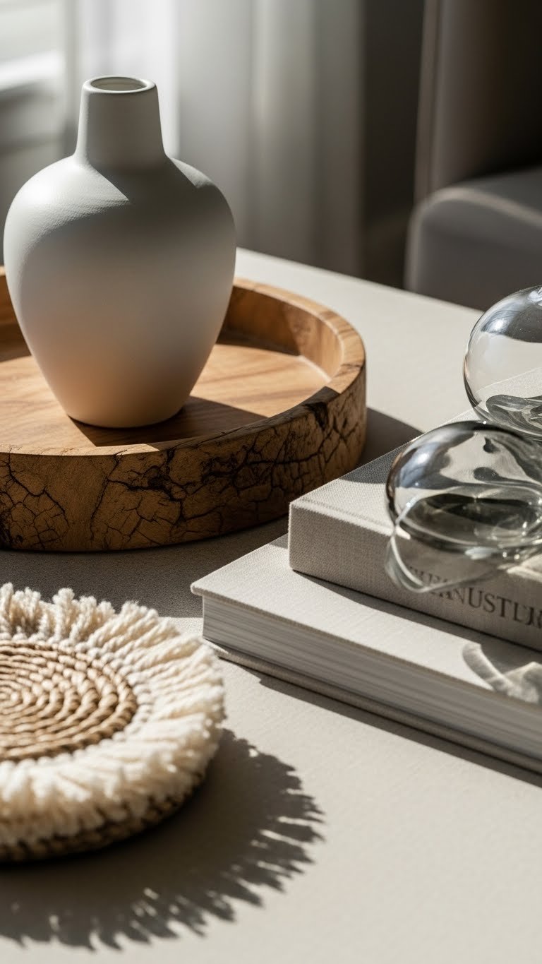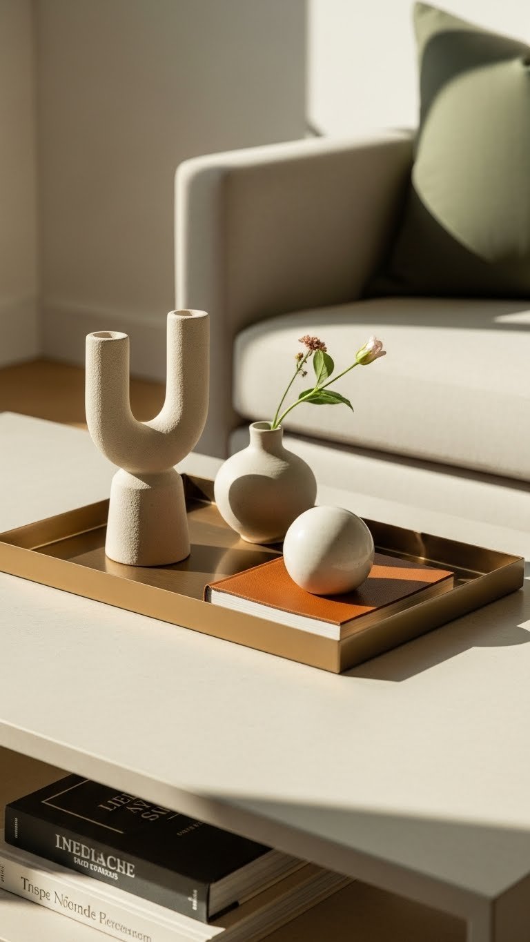Pull a tray together to ground your tabletop and keep styling from drifting into clutter. Choose a minimalist anchor — a low-profile tray in warm metal or matte wood — then arrange a weighted centerpiece, a small vase, and one tactile object.