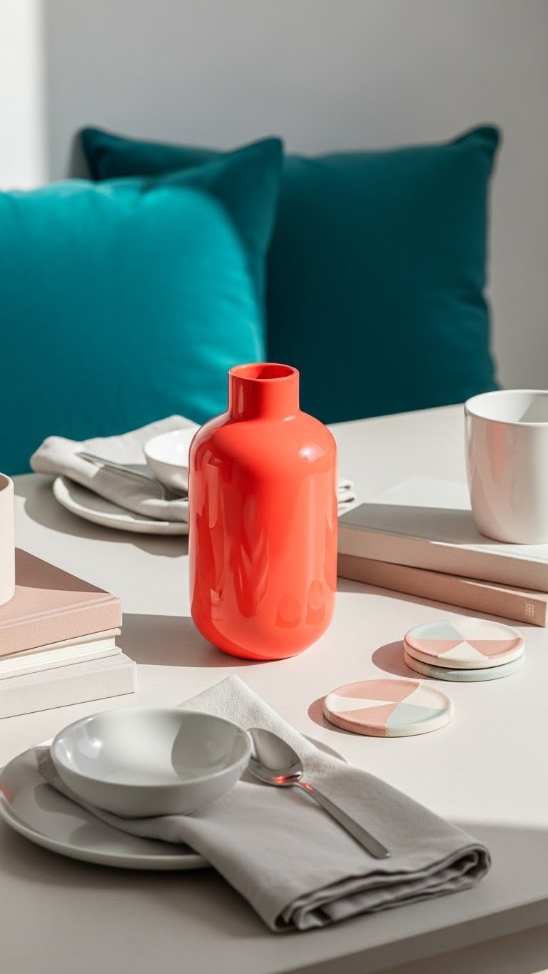 Pair bold pillows nearby to echo color without clutter, tuck neutral accents around, and set ceramic coasters as small, functional art. The result feels intentional, free, and modern: one confident hue liberates the whole tabletop composition.