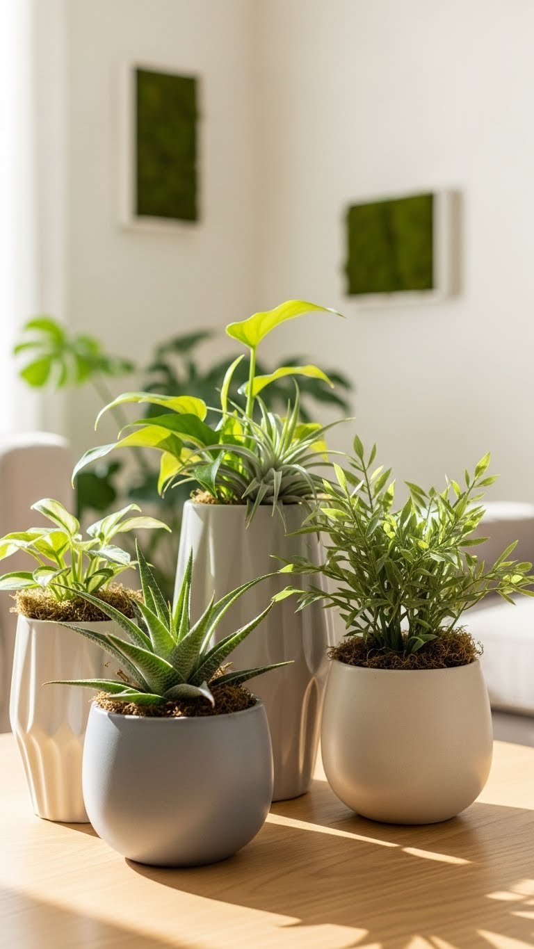 Adding living greenery brings instant freshness and a softer scale to your coffee table vignette. Choose air purifying foliage or low maintenance succulents in sculptural pots, mixing textures and heights for a collected look. Try a small vertical moss tray or a discreet wall mounted planter behind the table to extend the scene. You’ll enjoy a calm, liberated corner that breathes.