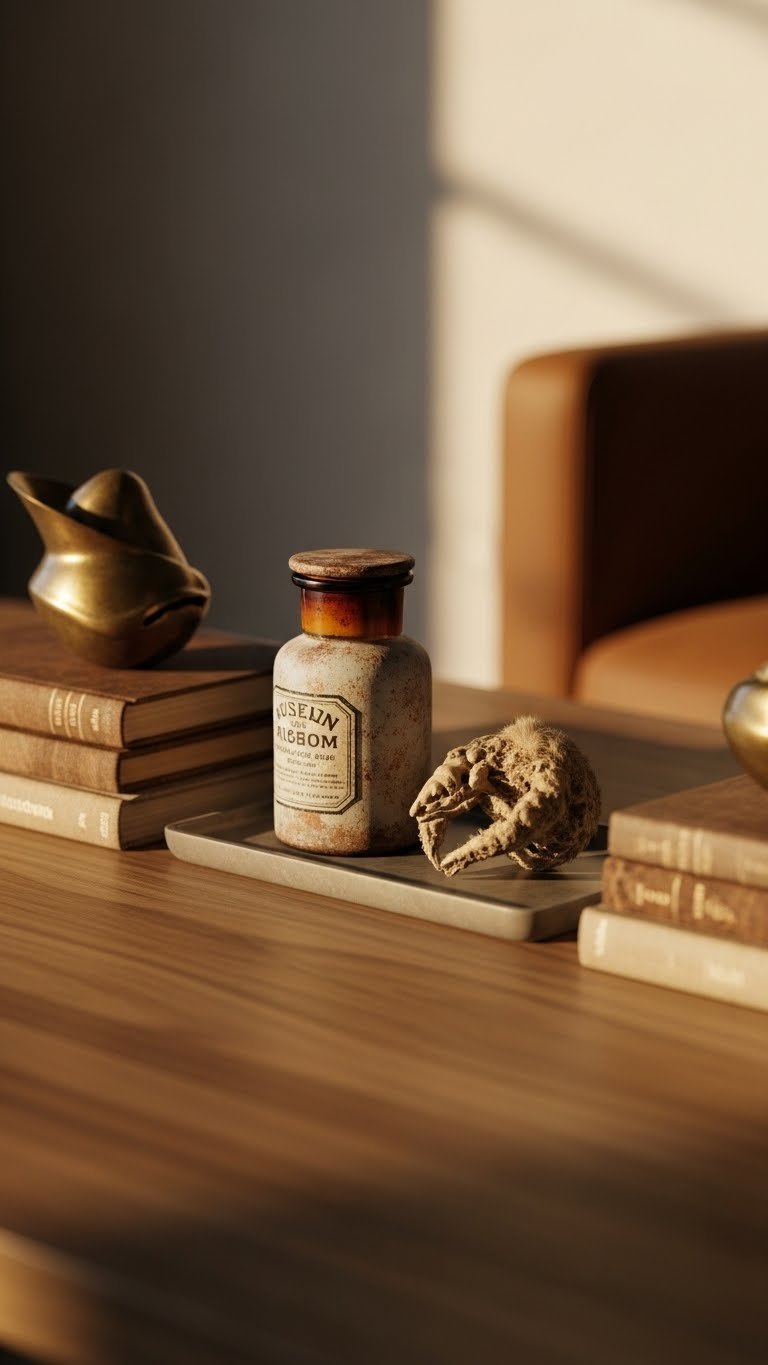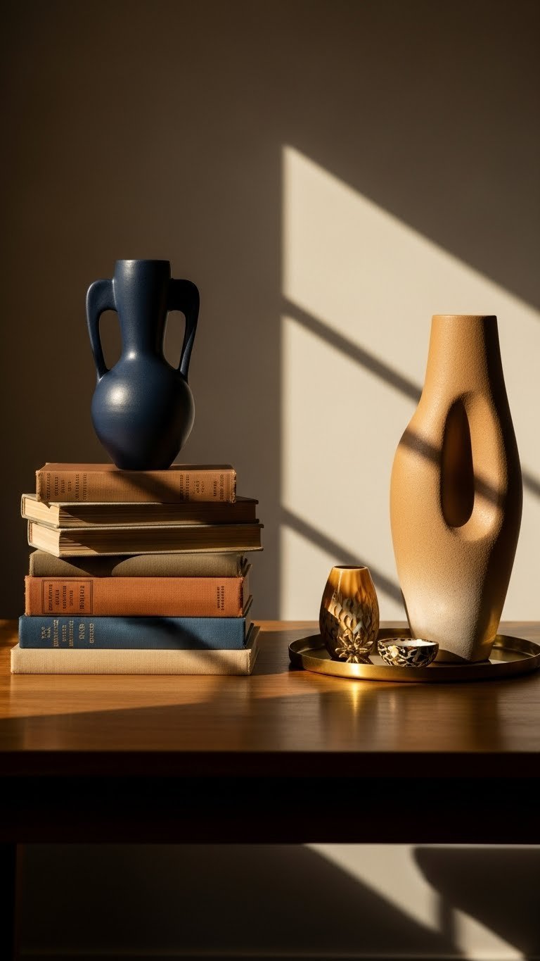 After you’ve curated that intimate mini library, introduce a single sculptural piece to anchor the table and lift the composition. Choose a form that reads as modern minimalism — clean lines, tactile presence — or something outdoor inspired like weathered stone or driftwood.