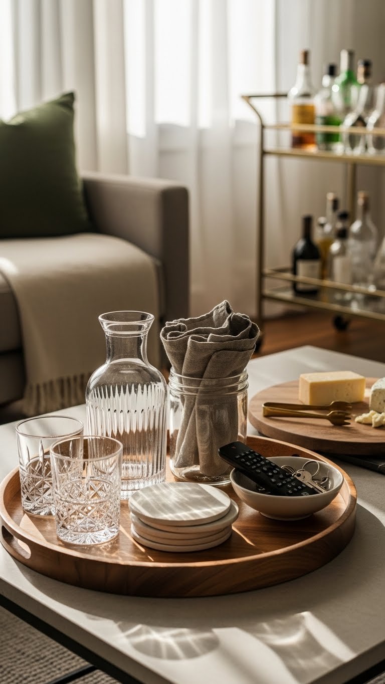 When you’re planning a vignette with guests in mind, blend beauty with purpose: keep a stylish tray for drinks, a stack of coasters, an accessible jar of napkins, and a small bowl for keys or remotes so the table looks curated and stays useful. Add serving essentials like a compact cheese board and tongs; link to a nearby bar cart for overflow, keeping the scene effortless and free.