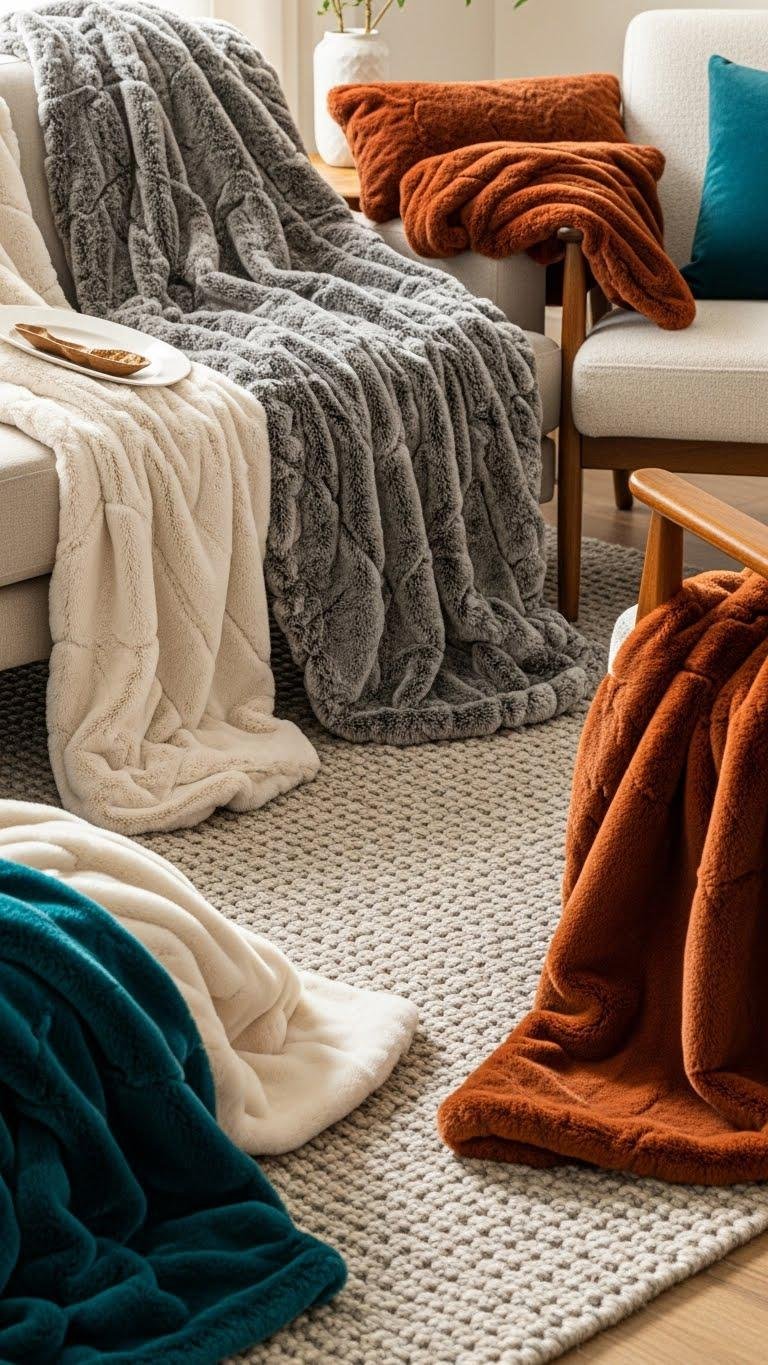 After you’ve set the floor with a generous, textured rug, layer in faux-fur throws to raise the room’s tactile temperature and add instant visual luxury. You’ll use faux fur draping across sofas and armchairs, mixing neutrals and bold tones.