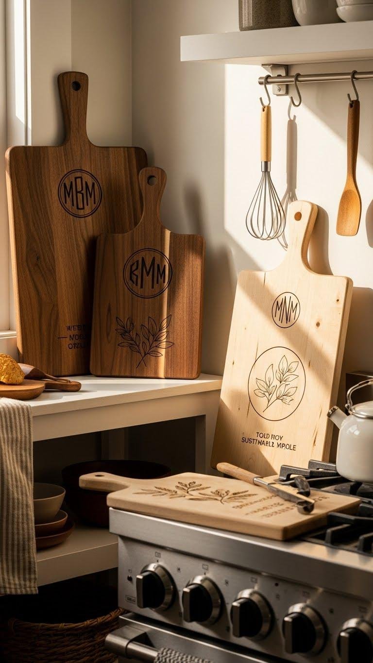 An engraved cutting board turns everyday prep into a display-worthy detail, so choose pieces that double as art and workhorse: think warm walnut or sustainably sourced maple laser-etched with simple monograms, botanical motifs, or seasonal phrases. You’ll arrange one upright on a shelf or lean it by the stove, letting artisan typography and patina speak — perfect for practical style and heirloom gifting.