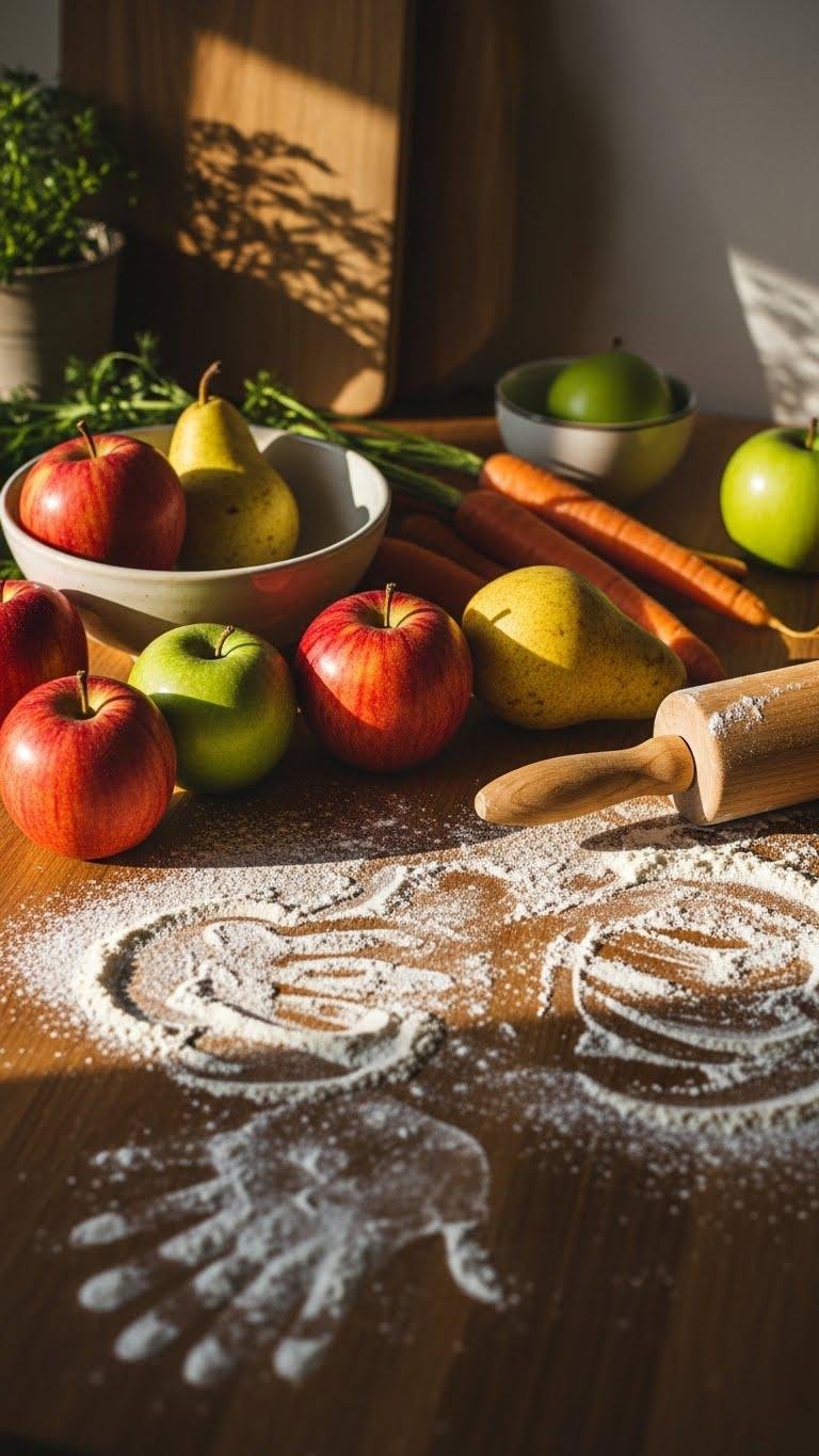 Let the warmth of those displayed boards spill onto your work surface by styling a flour-dusted countertop that feels lived-in rather than messy. You’ll arrange rustic produce—apples, pears, heritage carrots—around a simple bowl, sprinkle measured flour art patterns, and leave a rolling pin casually nearby. This curated scatter reads authentic, effortless, and modern, inviting you to bake, linger, and breathe freely.