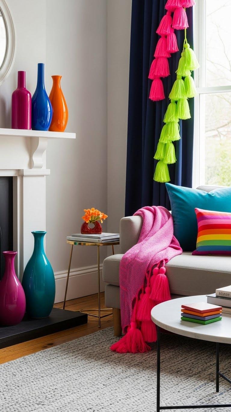 A few well-chosen colorful dopamine accessories can instantly lift a winter room and keep your mood bright on gray days. You’ll choose bold accents that feel fearless: neon tassels on throws and curtains, sculptural vases in saturated hues, and practical pops like rainbow coasters on side tables. They energize without clutter, letting you personalize space confidently and enjoy cozy freedom all season.