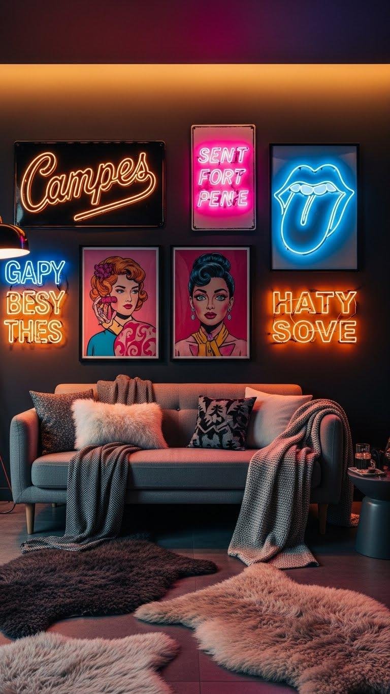 Bring in playful, campy wall art to inject instant personality and a wink of humor into your winter scheme — think oversized enamel signs, glossy pop‑surreal prints, and tongue‑in‑cheek neon phrases that contrast the season’s soft textures.