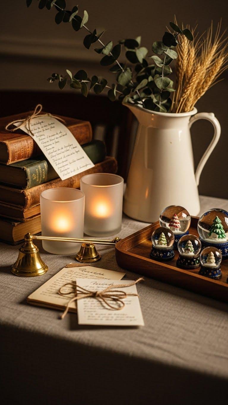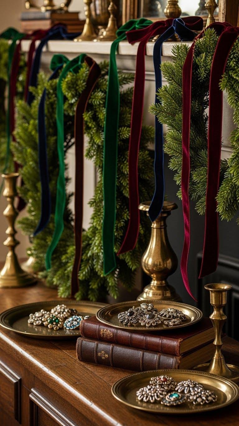 Tie velvet ribbons through wreaths, drape them over mantels, or knot them around vintage glassware to add tactile luxury and a curated antique vibe to your winter decor. You’ll pair velvet bows with tarnished trays, cluster antique brooches on books, and anchor displays with brass candlesticks.