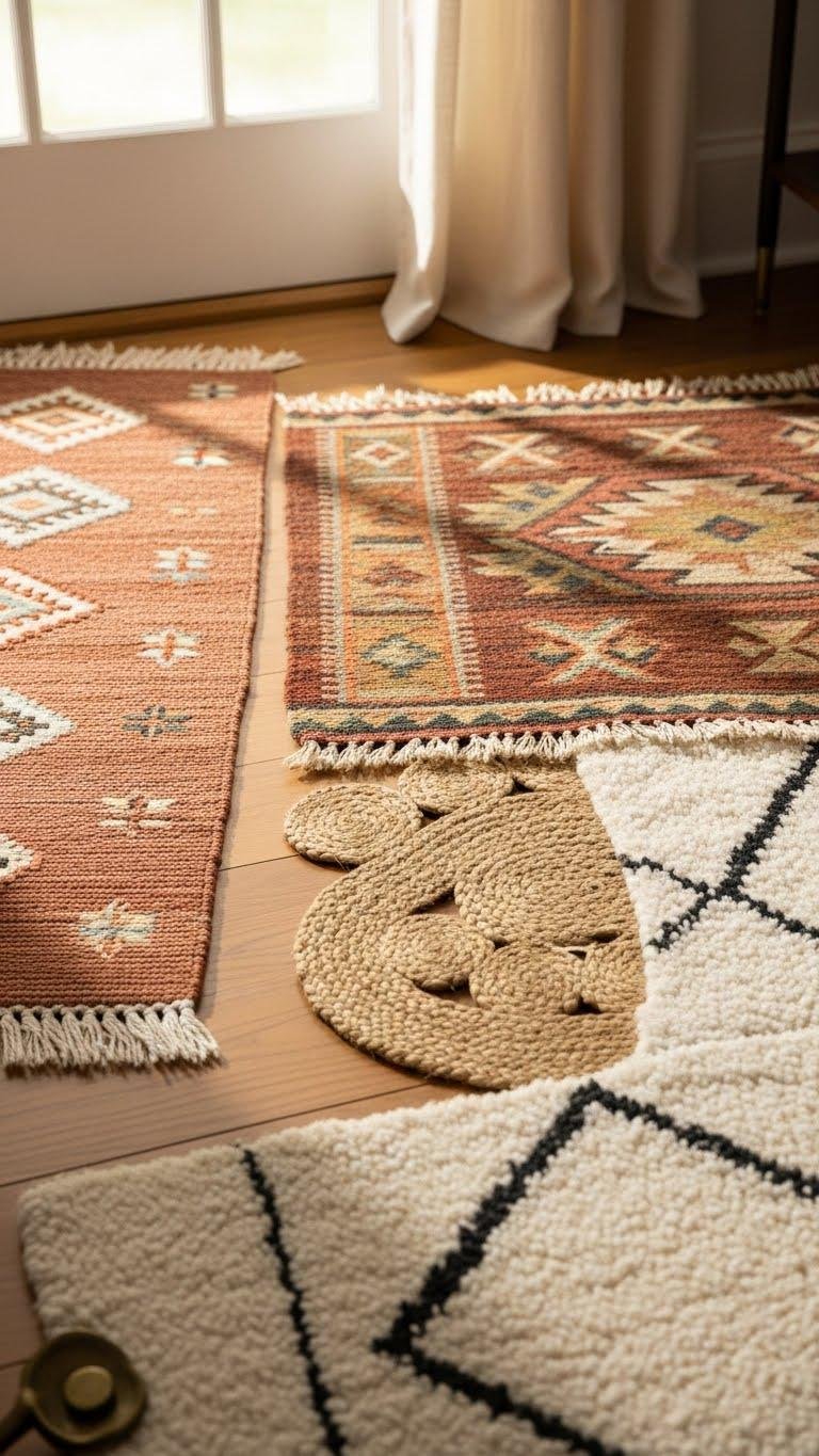 After you’ve anchored a mantel with velvet bows and aged brass, extend that layered, tactile approach to the floor with mixed rugs that feel curated rather than matchy. You’ll pair doorway runners with larger kilims, layer a braided jute beneath a plush wool for contrast, and stagger patterns to guide traffic. Trust instinct, edit boldly, and let your floors breathe freedom.