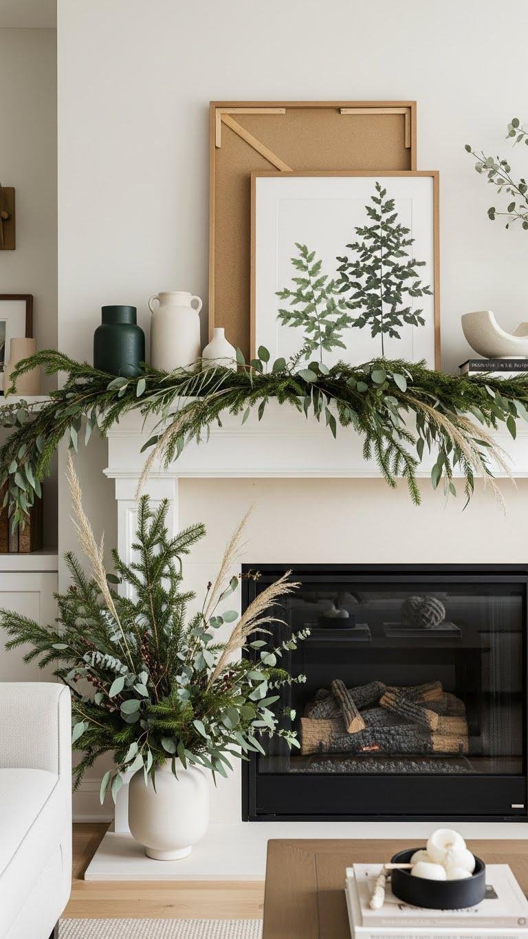 A well-styled fireplace becomes the room’s seasonal centerpiece, and you can shift its mood with a few carefully chosen accents. Layer mantel greenery with mixed textures—fir, eucalyptus, dried grasses—so it reads modern yet effortless.