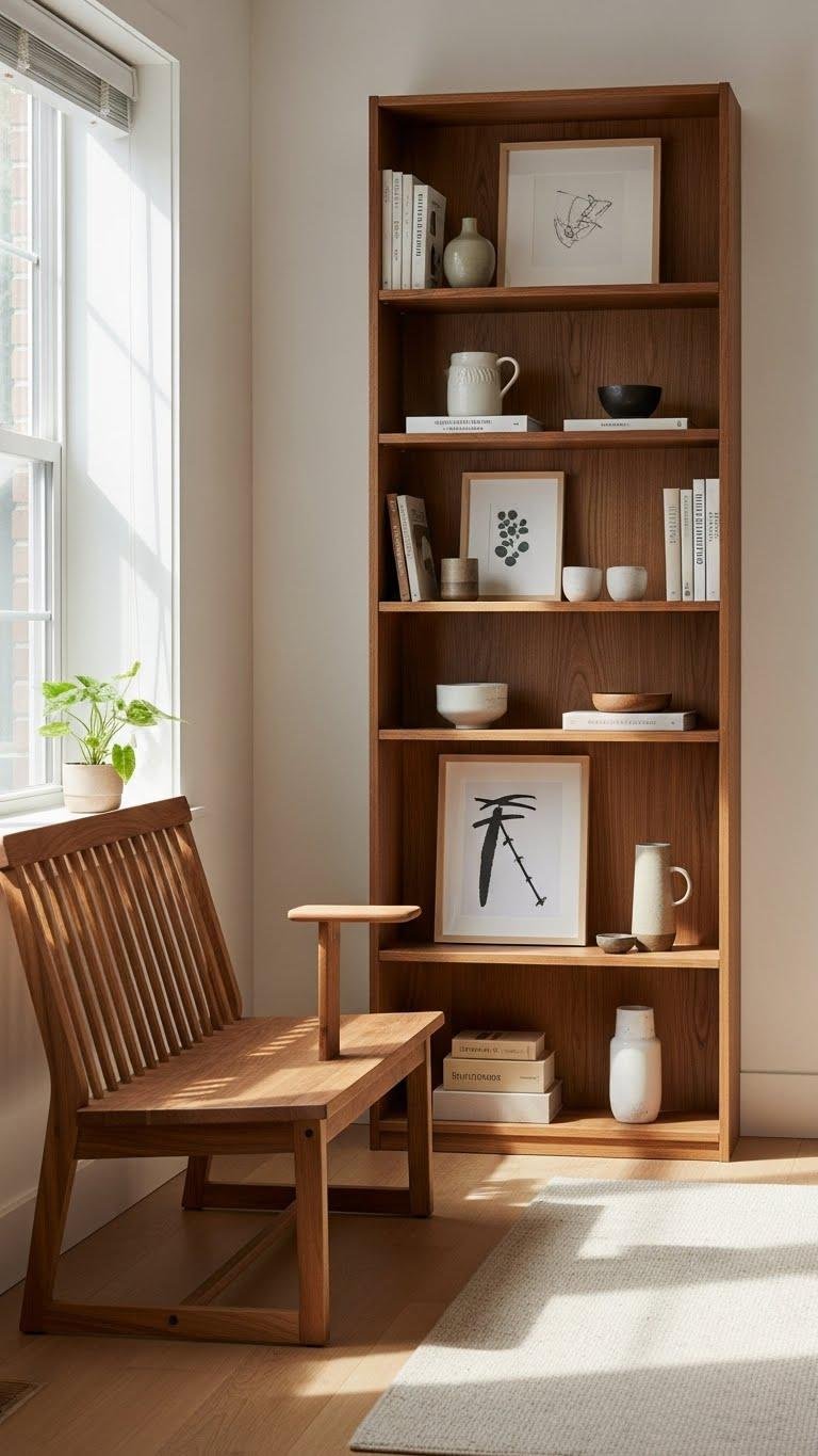 Let a freestanding bookcase anchor a wall, its open shelves framing art and finds, while a movable bench shifts for seating or a window perch.