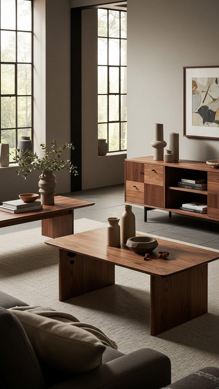 Rustic plankwork and cerused panels set the stage for walnut furniture to deepen a room’s character—think a low-profile sofa table, sculpted coffee table, or a paneled media console that grounds the space with rich, chocolate tones and satin sheen.