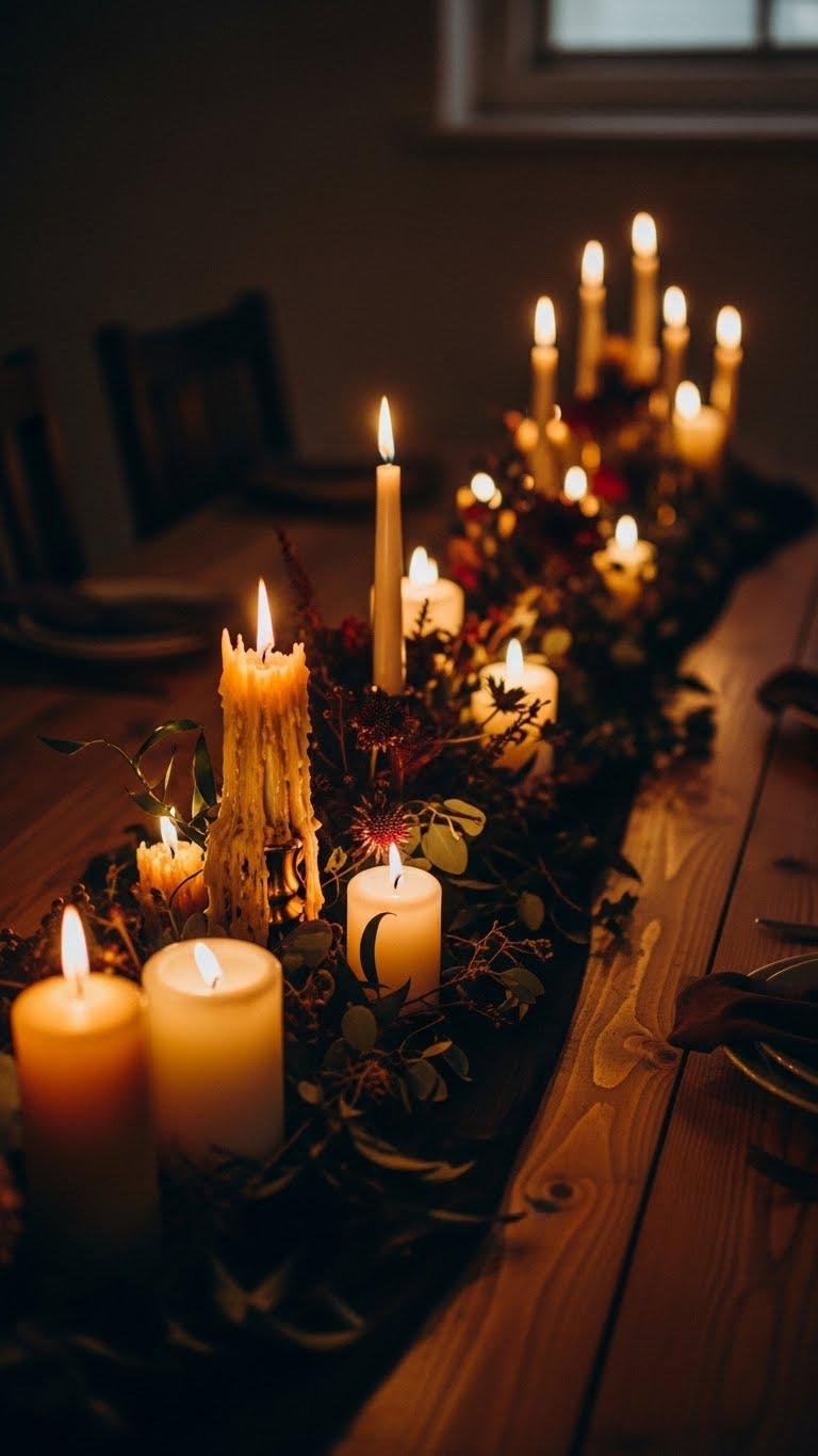 Set a moody, intimate tone by grouping candles of varying heights and finishes down the center of your table, letting their warm glow sculpt the space and pull attention to your carefully chosen pieces. You’ll arrange low slung candles and taller tapers to cast flickering silhouettes, embrace wax pooling as texture, and tuck moody florals between holders for an effortlessly liberated, sophisticated tablescape.