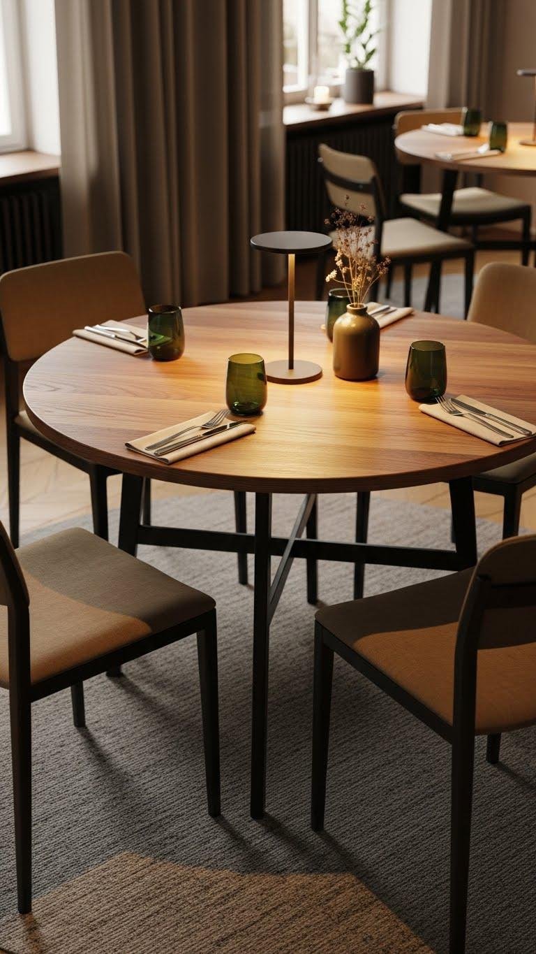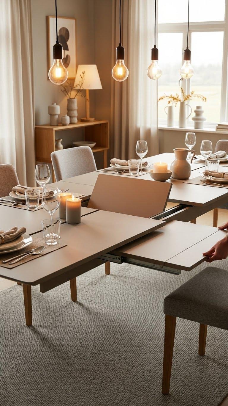 Opt for an extendable table and you’ll get a dining surface that adapts to daily life and occasional crowds without sacrificing style. Choose models with discreet space saving mechanisms and clean extendable finishes so you’re ready for guests or a quiet meal. You’ll enjoy freedom to rearrange, effortless expansion, and lasting elegance that supports unpredictable plans without compromising proportions or design.