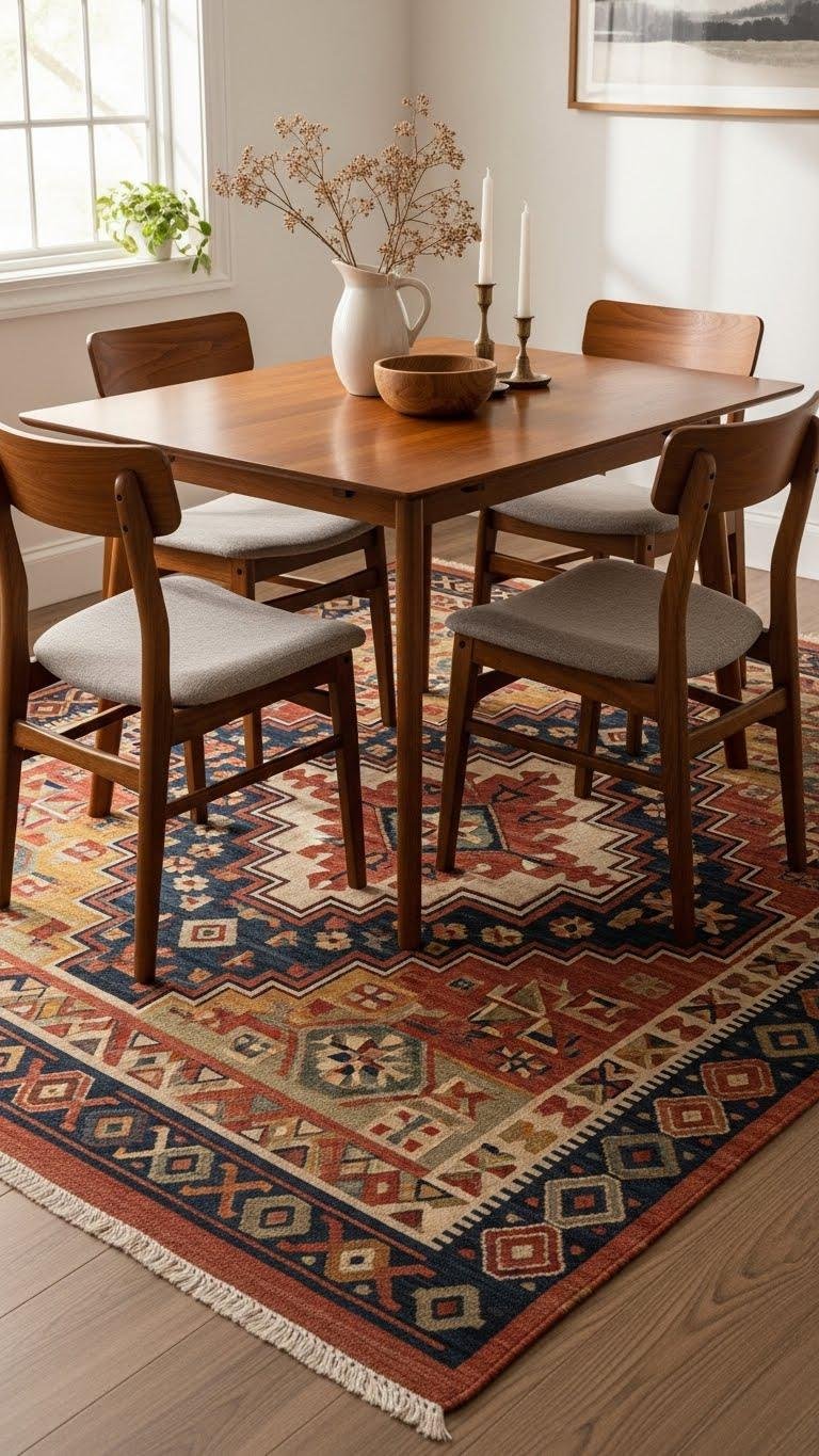 A single patterned rug can instantly anchor your dining area and give the room a clear visual center; pick a scale and color palette that complements your table and traffic flow. Choose a patterned kilim or low pile geometrics to balance warmth and practicality. You’ll define zones, protect floors, and express personal style without clutter — bold, restrained, and freely intentional.