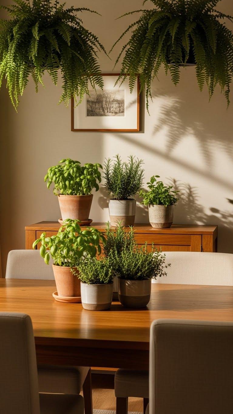 Introducing potted plants or a compact herb display brings living texture and subtle scent into your dining room, and you’ll get both visual warmth and practical use from the same pieces.